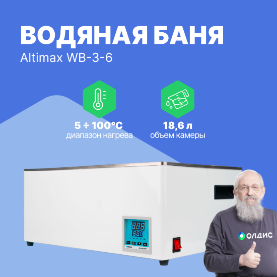 Altimax WB-3-6 — водяная баня предназначена для нагрева колб, пробирок и стаканов в диапазоне температур от комнатной до 100 °C. Она используется в медицине, биологии, биохимии, физической химии, химии, анализе качества продукции и сырья, а также в других областях, где требуется термостатирование и нагрев в узком температурном диапазоне. Баня оснащена цифровым ПИД-регулятором, защитой панели управления от случайного попадания жидкости и обеспечивает высокую точность нагрева. В ней предусмотрено 6 рабочих мест.