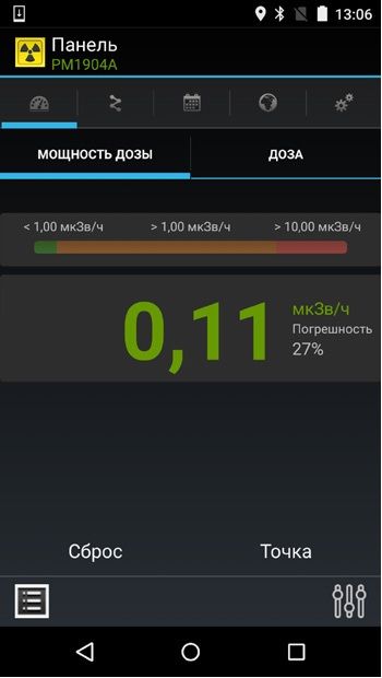 индикация: от 0,01 мкЗв/ч до 13 мЗв/ч