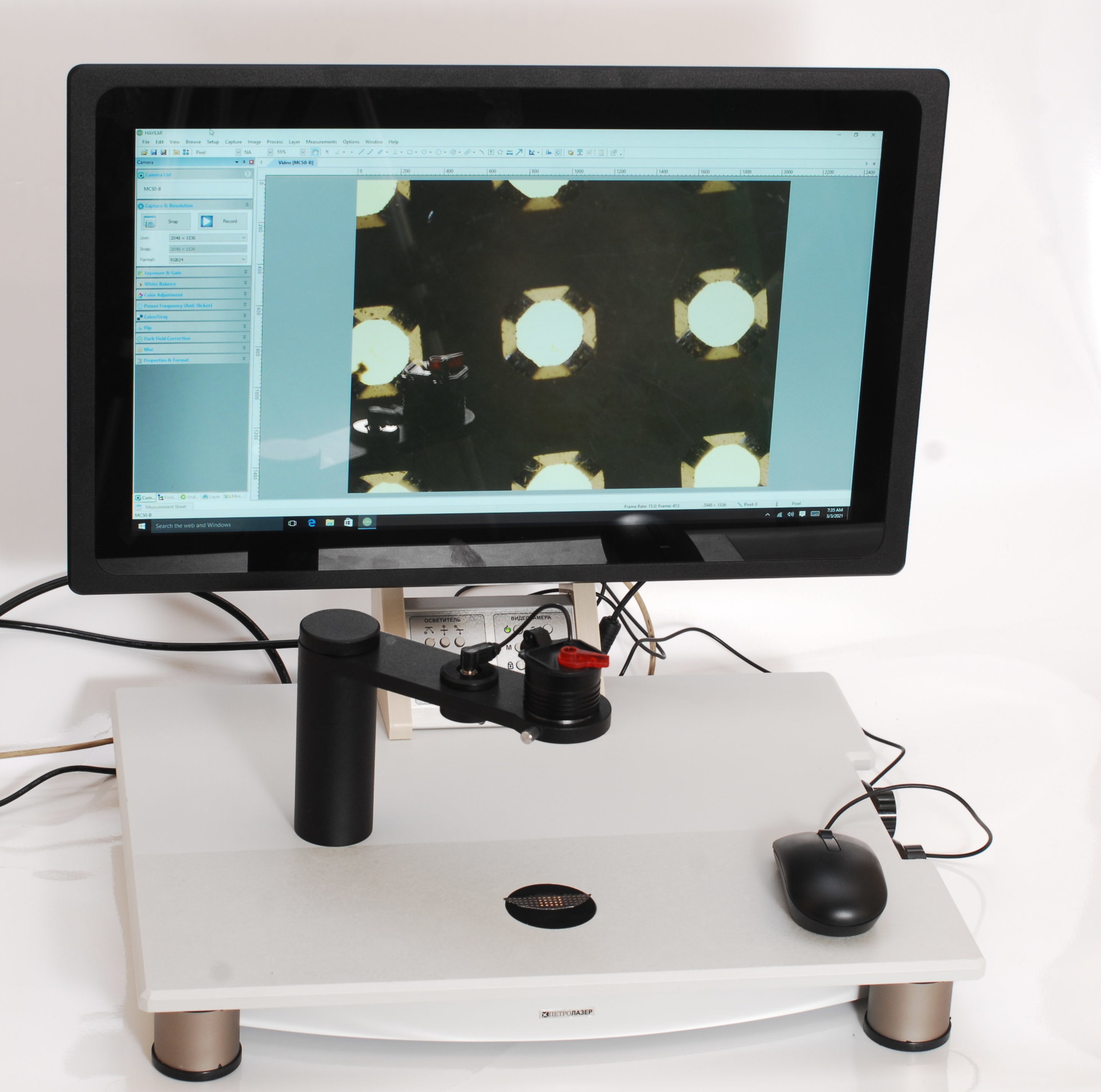 Микроскоп инвертированной схемы, со встроенной цифровой камерой и моторизованным зум- объективом обеспечивает запись, хранение, обработку и измерение геометрии изображений на встроенном промышленном компьютере. Осветительная схема модульная, имеет пять каналов освещения.