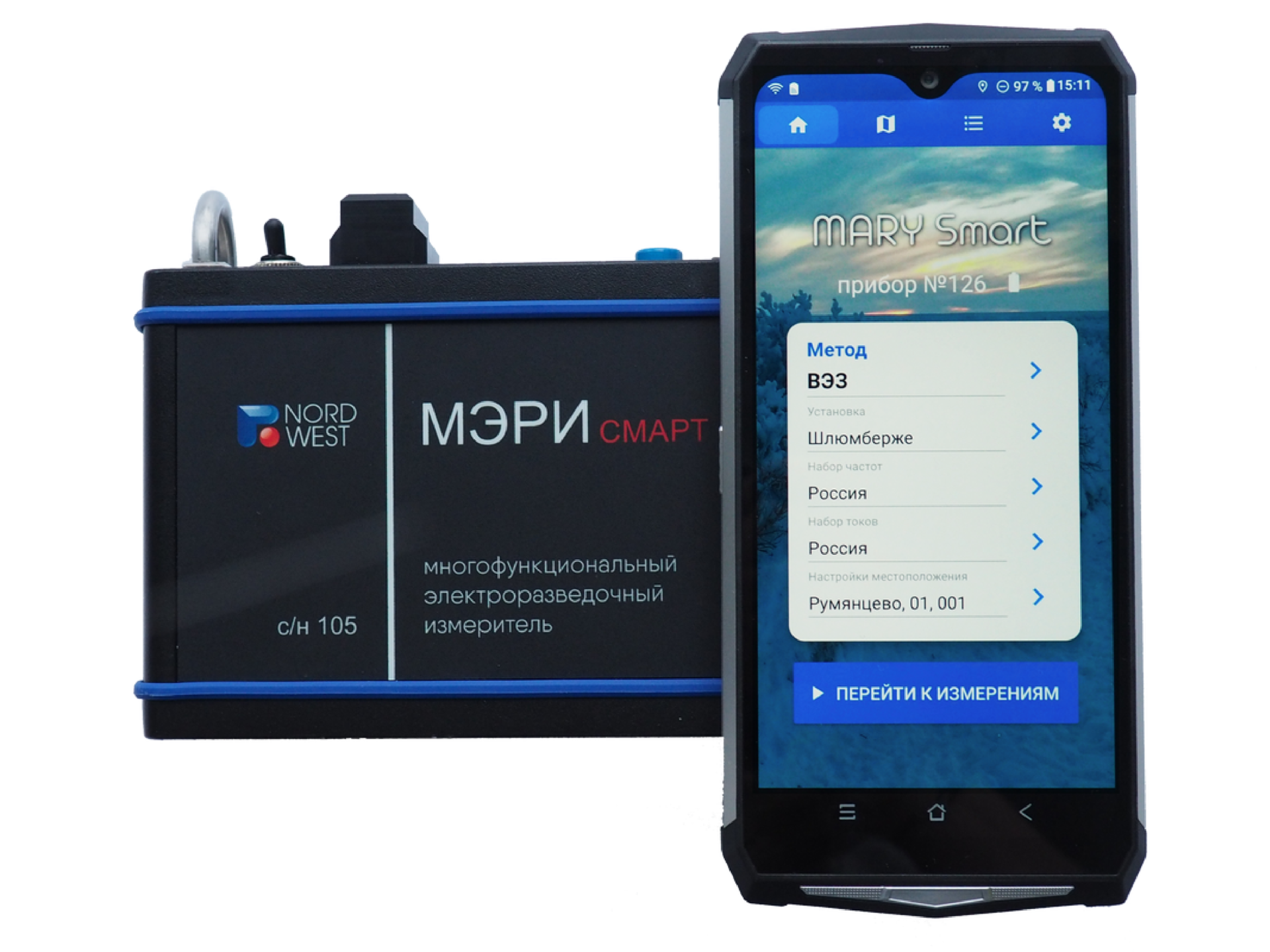 МЭРИ Смарт – это одноканальный электроразведочный измеритель с 24-битным АЦП, низкими собственными шумами (<1 мкВ), управляемый с помощью смартфона.