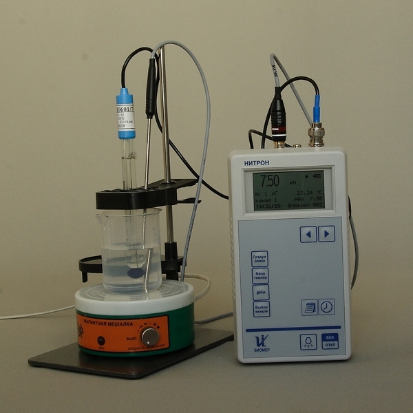 рН — метр — термометр Нитрон — рН предназначен для измерения активности ионов водорода (рН), окислительно-восстановительного потенциала Eh и температуры водных растворов. Принцип работы прибора основан на применении метода прямой потенциометрии. Определяет кислотность молока в градусах тернера.