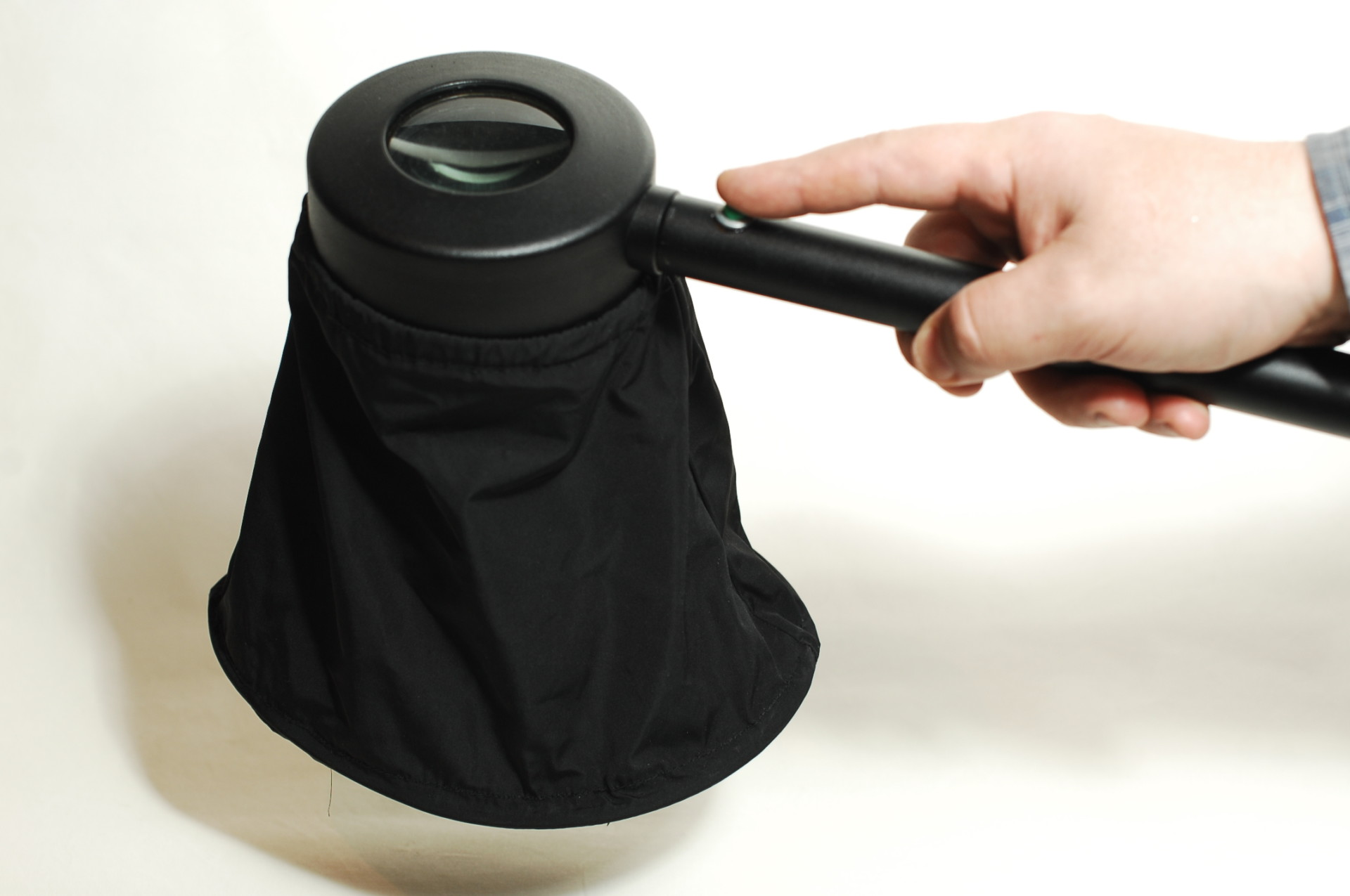 Наличие съемной тканевой бленды , как и сама конструкция осветителя, затеняет объект исследования от постороннего света.  Такая конструкция снижает освещенность в поле наблюдения и повышает контраст, а значит — и обнаружительную способность прибора.  Увеличительная стеклянная линза поглощает ультрафиолет и надежно защищает глаза исследователя, эксперта, или лаборанта от отраженного или рассеянного УФ излучения.