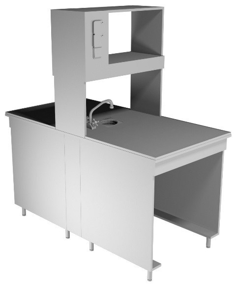 Габаритные размеры 760*1520*1650 Столешница слостый пластик. Сантехника.Центральная вставка из цельносварного металлического каркаса в порошковой окраскеНадстройка со светильником и двумя розетками с каждой стороны, сантехника.Регулируемые по высоте металлические опоры.