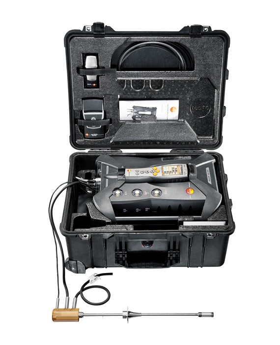 Анализатор дымовых газов testo 350-MARITIME, оснащен сенсорами O2,CO, CO2-(ИК), NO и NO2, блоком пробоподготовки, памятью данных (измерение SO2 по запросу); управляющим модулем Testo 350-MARITIME; соединительным кабелем (2 м) между блоком управления и анализатором; зондом отбора пробы с предварительным фильтром и специальным шлангом для измерений NO2/SO2 (длина 2,2 м); монтажным фланцем для газоотборного зонда, прочным защитным кейсом-тележкой, кабелем с клеммами для аккумулятора, для подсоединения к Testo 350-MARITIME; сертификатом Germanischer LLoyd (GL) номер 59488-08 НН