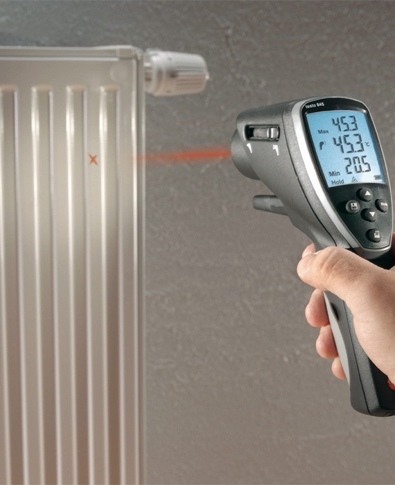 testo 845, инфракрасный термометр с крестообразным лазерным целеуказателем, со встроенным модулем влажности, переключаемой оптикой для измерений на близких и дальних расстояниях, разъемом для контактного зонда температуры, оптическим/акустическим сигналом тревоги, памятью для измеренных значений, ремнем для переноски, ПО для ПК, USB кабелем для передачи данных, алюминиевым кейсом, батарейкой и заводским протоколом калибровки