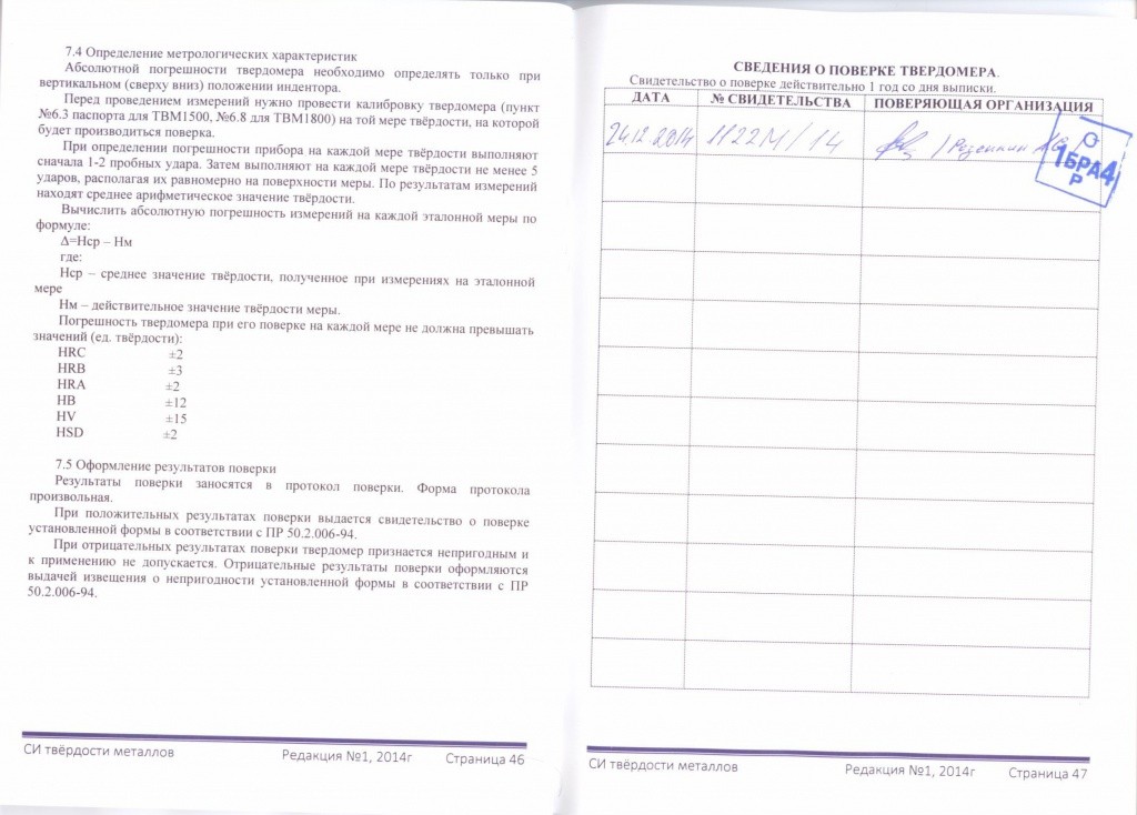 Твердомеры портативные динамические модификаций ТВМ 1500 и ТВМ 1800 являются средствами измерений, зарегистрированными в Государственном реестре СИ России под № 57899-14, межповерочный интервал 1 (один) год.