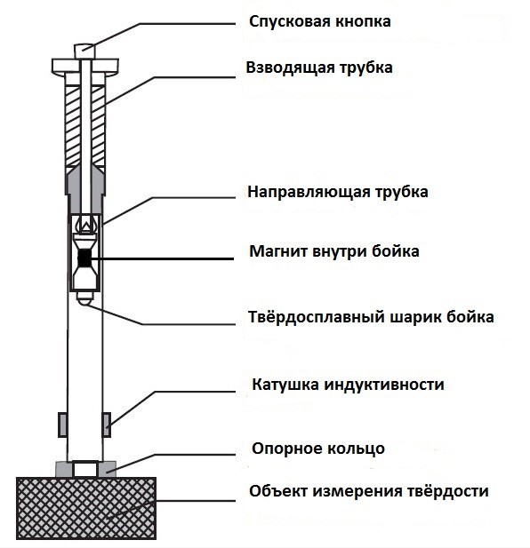 Принцип действия твердомера основан на измерении отношения скоростей индентора (ударного элемента) при падении и отскоке, преобразуемого в значение твёрдости. В международных стандартах с 1975г. этот метод измерения твёрдости называется методом Либа и результаты измерения твёрдости изделий указываются в величинах твёрдости Либа (HL), однако в России этот метод не стандартизирован. Поскольку электронный блок твердомера преобразует измеренные твердомером значения твёрдости в стандартизированные в России шкалы твёрдости Роквелла (HR), Бринелля (HB), Виккерса (HV) и Шора D (HSD), то такой метод измерения твёрдости именуется «косвенным». Измерение твёрдости «косвенным» методом всегда уступает в точности и имеет большую погрешность, нежели измерение твёрдости «прямым» методом по шкалам твёрдости Роквелла (HR), Бринелля (HB), Виккерса (HV) и Шора D (HSD). Этот момент необходимо учитывать если вы выбираете прибор измерения твёрдости для лаборатории с требованием высокой точности измерений и минимальной погрешности — в этих случаях придётся отказаться от твердомеров портативного типа (с «косвенным» методом) и выбрать твердомер стационарного или переносного типа (реализуют «прямой» метод измерения твёрдости).