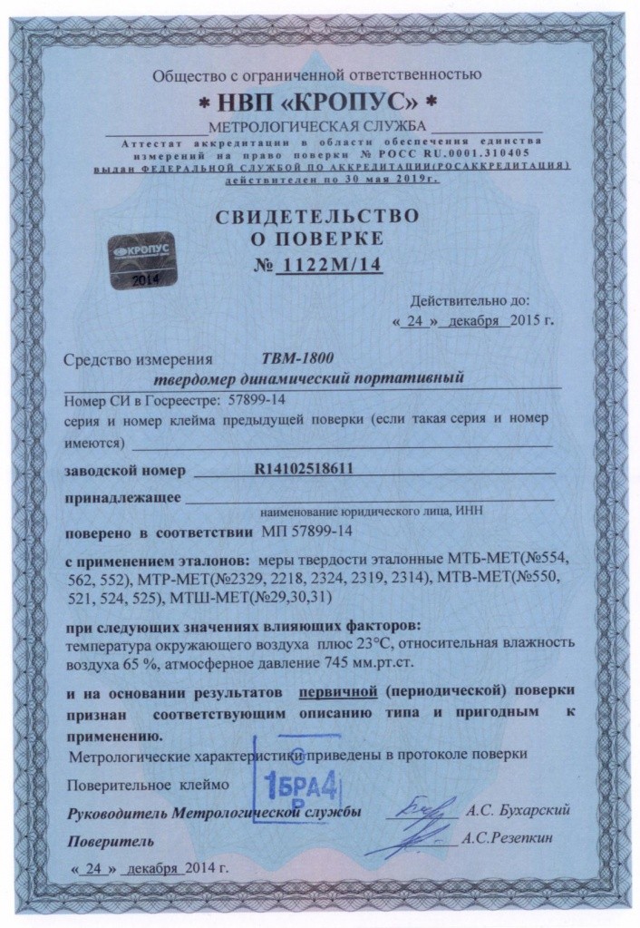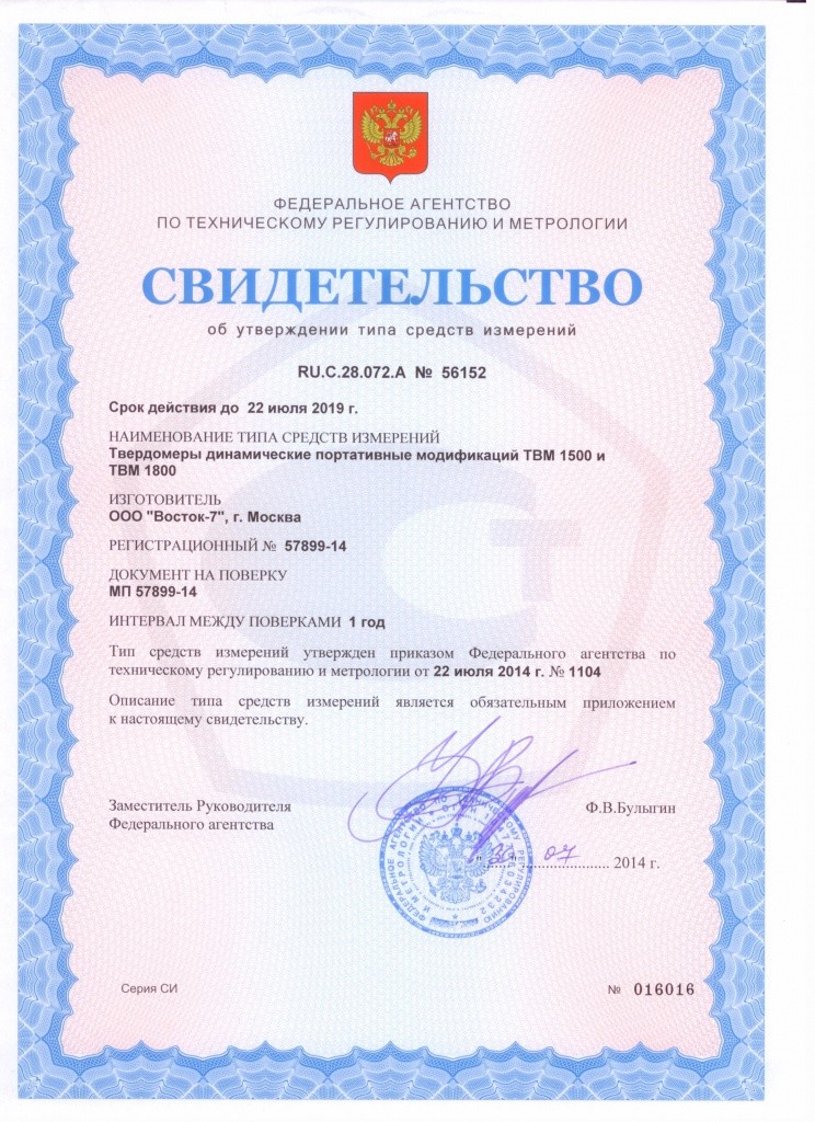 Твердомеры портативные динамические модификаций ТВМ 1500 и ТВМ 1800 являются средствами измерений, зарегистрированными в Государственном реестре СИ России под № 57899-14, межповерочный интервал 1 (один) год.