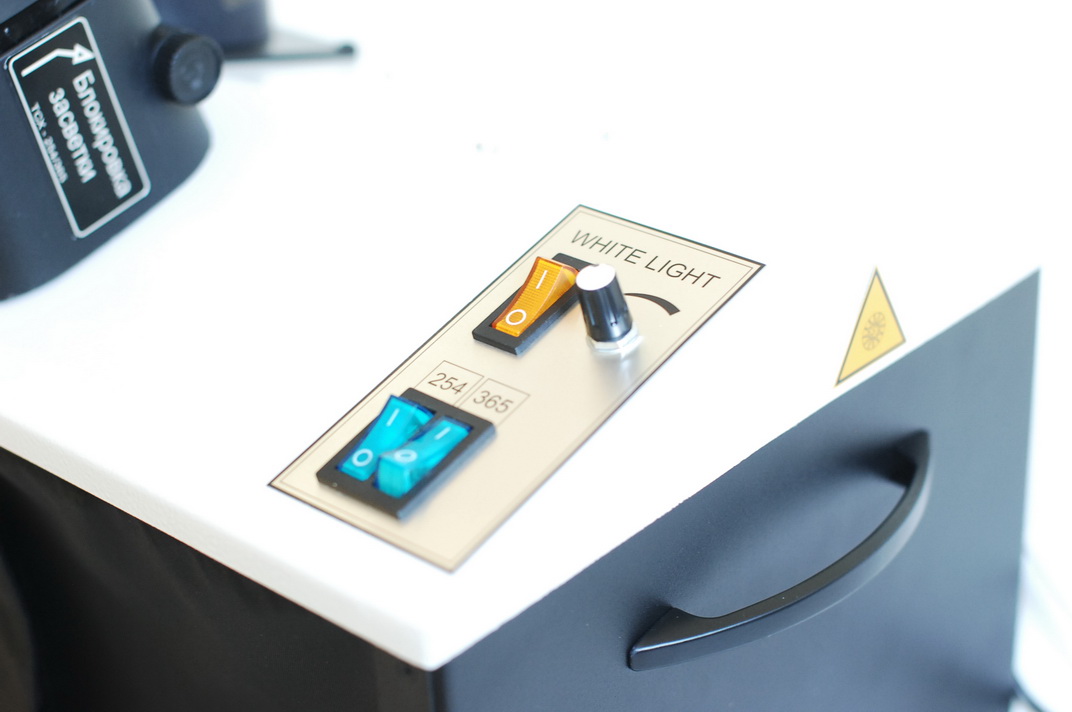 Безопасность зрения лаборанта обеспечивается как используемым защитным УФ-фильтром, который установлен перед окуляром, так и гораздо более редкой необходимостью наблюдать образец визуально: его прекрасно видно на экране дисплея или компьютерного монитора. УФ-осветитель к аналитическому кабинету снабжен специальными светоизлучающими диодами мощностью 20 Вт (365 нм) + 15 Вт (254 нм) и спектрально-селективными фильтрами (увиолевое стекло). Такая конструкция и оптическая схема позволяют добиться отсутствия мешающего видимого излучения и повысить контрастность и обнаружительную способность при исследовании.