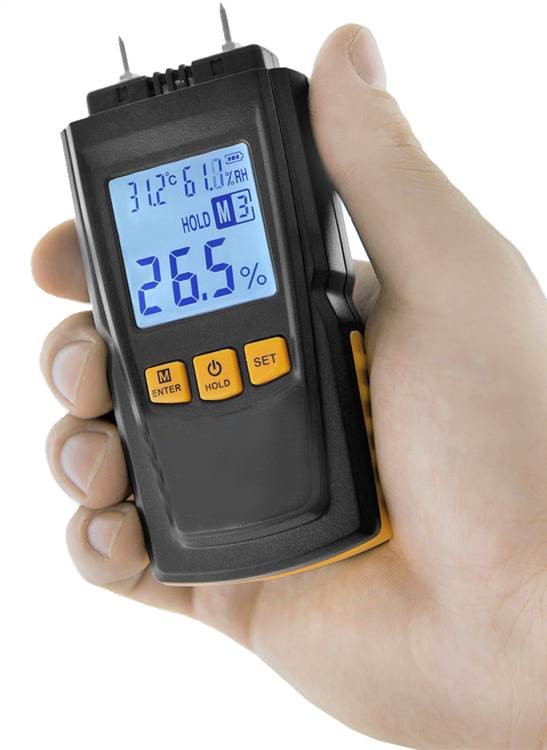 Электрический влагомер измеряет сопротивление между двумя иглами. Различные породы деревьев, направление текстуры древесины, температура и глубина проникновения зонда (датчика с иглами) – это факторы, которые влияют на точность измерения. Замеры на горизонтальной текстуре дают меньшую погрешность, чем на вертикальной. Плотность дерева мало влияет на содержание влаги в древесине, например, мягкая сосна имеет большую разницу с плотностью дуба, но у них очень похожая влажность друг с другом.